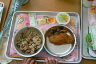 当日の献立は・・・ひじきご飯、白身魚フライ、昆布の炒め煮、 タルタルソース、八女茶ムース、牛乳でした。