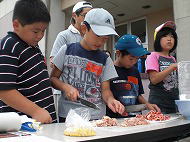 楽しい夕食作り・・・メニューはキャンプの定番「カレー」です。初めての飯ごう炊飯で楽しそうです。