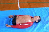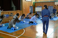 救命処置の流れの説明を受け実際に心肺蘇生の練習を行いました。救急車到着までの時間に近くにいる人が迅速且つ適切に行うことが救命確率を上げることにつながります。