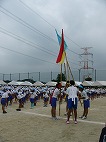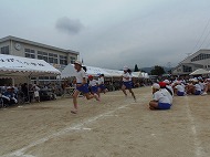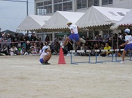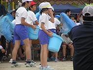| 団競:リオへの道〜バトンをつないで〜 ハードル・網くぐり→バケツでボールキャッチ→タイヤ引き→三人四脚でバトンをつなぎます | |||