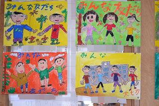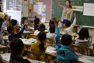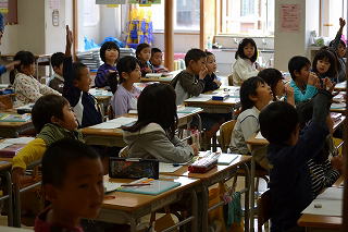 1年生の教室では、元気いっぱい手を上げて頑張っていました。