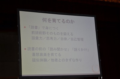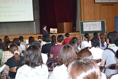 学習参観の後、家読講演会が行なわれました。 脳科学的にも読み聞かせの大切さを知り、参加者は真剣に聞き入っていました。 テーマ:子供を読書好きにするコツ〜脳科学、認知心理学の世界から〜 講師:内海義彦先生
