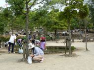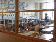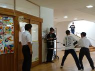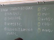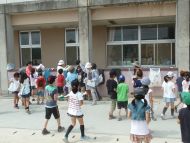| 校舎内に不審者が侵入したという設定で、不審者対応訓練が行われました。 不審者の侵入と共に校内放送が流れると、児童たちは先生の指示に従って鍵のかかる教室に 避難し、ドアと窓を閉めてみんなで寄り集まって静かに身を潜めていました。 |