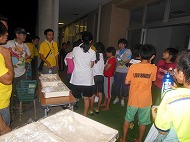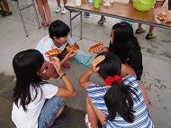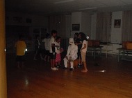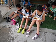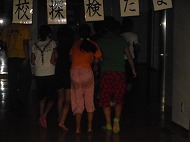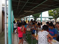| お待ちかねの学校探検が始まりました。「キャー」校舎に悲鳴が響きます(・_・;) どんな「おばけ」がいましたか?4つのキーワードを見つけたら出口へ。 ホッとしたら、お腹がすいてきました。 おにぎりたくさん食べてね。 |