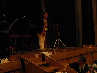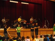 | 親父バンドと先生方のコラボ。会場はとても盛り上がってきました。 最後は、子ども達と一緒に ♪あいうえおんがく♪ |