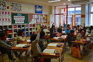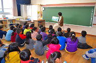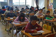 | 授業が始まり、真剣な眼差しで先生のお話をよく聞いていました。また、模造紙にグループでまとめているクラスもありました。 | |||