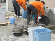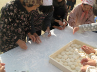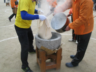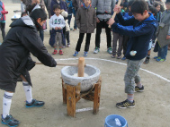 | 12月20日(日)、のぞみが丘小学校運動場で、5年生と6年生を対象に、父親の会主催による餅つき大会が行われました。 「もち米をかまどで蒸し、杵と臼でつき、お餅を丸める」といった伝統的な体験を楽しみました。 |