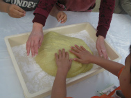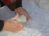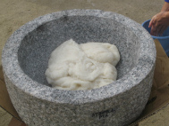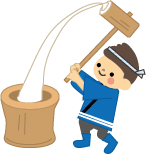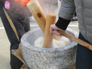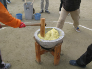 | (きな粉 あんこ、砂糖醤油、のり、大根おろし 好きなものをつけていただきました) | (サツマイモを混ぜた餅もつきました。 ほんのりお芋の香りがして美味しかったです) |