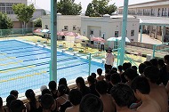 | ♪閉会式では校長先生から労いと激励のお言葉がありました。♪ 水に浮くことは水の事故から自分の命を守るために必要なこと、 目標に向けて努力する大切さ、 ここがゴールではなく来年を目指して頑張ろうとする向上心、 息継ぎの仕方は、ハーモニーinおごおりでの歌の練習にも役立つこと。 |