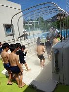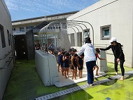 水着に着替えて、体育館で校長先生のお話や注意事項を聞いたり準備体操をしたりして、いよいよプールへ。初めにシャワーを浴びます。水量や水圧に驚き、なかなかシャワーに入れない子どもたち・・。中で10秒シャワーに当たらないといけませんが、キャーキャー言ってみんな数秒で出ようとしていました。