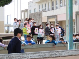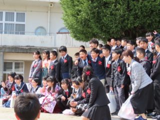 教室に入ることができないため、運動場で最後のホームルームをしました。あすなろの木の周りで各クラスが集まり、写真撮影をしたり、先生へサプライズのプレゼントやお花も渡すなど、思い思いに別れのひとときを過ごしました。