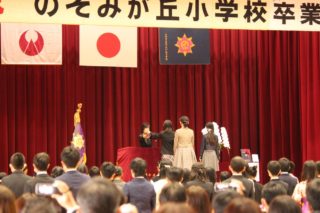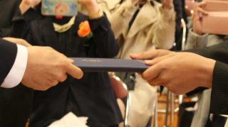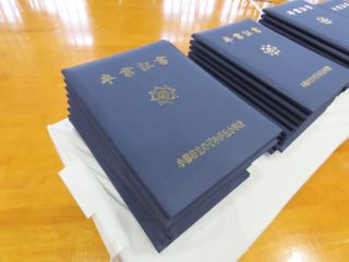 各担任の先生から全員の名前が呼ばれたあと、卒業生は大きな声で返事をして起立。各クラスの代表者が壇上に上がり、校長先生から卒業証書を授与されました。