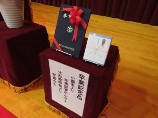 卒業記念品として、小郡市より卒業証書ホルダー、父母教師会より写真立てが贈られました。